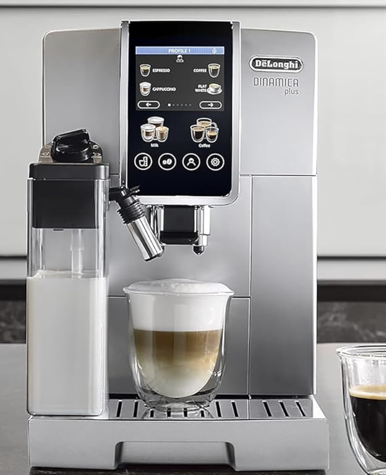 The De’Longhi Dinamica Plus is our top pick for the best overall super-automatic espresso machine. It hits the sweet spot between price, features, and espresso quality. The 3.5-inch touchscreen display makes drink selection and customization intuitive, and the LatteCrema milk system produces dense, silky froth that is a clear step above what most machines in this category deliver. With 16 drink options including espresso, cappuccino, latte, flat white, and even iced coffee (via the TrueBrew Over Ice feature), this machine covers virtually every drink you could want.